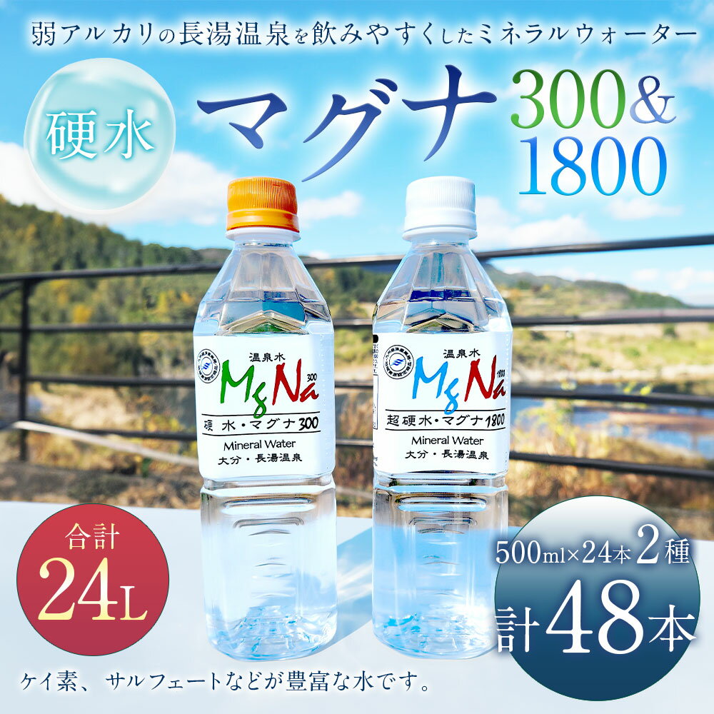 - 【ふるさと納税】硬水ミネラルウォーターマグナ300 500ml×24本&硬水ミネラルウォーターマグナ1800 500ml×24本 飲み比べセット 計48本 計2箱 アルカリ中硬水 長湯温泉水 竹田湧水 お水 飲料水 大分県産 国産 九州 大分県 竹田市 送料無料