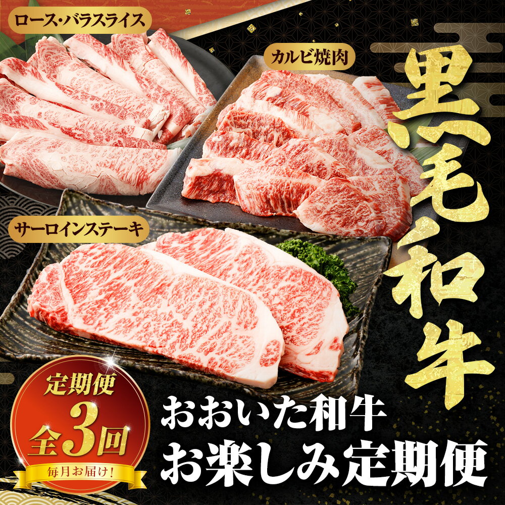 - 【ふるさと納税】【3ヶ月定期便】【黒毛和牛】おおいた和牛 お楽しみ3カ月間定期便 ロース・バラスライス 約400g×1パック サーロインステーキ 約170g×2枚 カルビ焼肉 約150g×2パック 合計約1.04kg 豊後牛 牛肉 国産 冷凍 贈り物 竹田市 送料無料