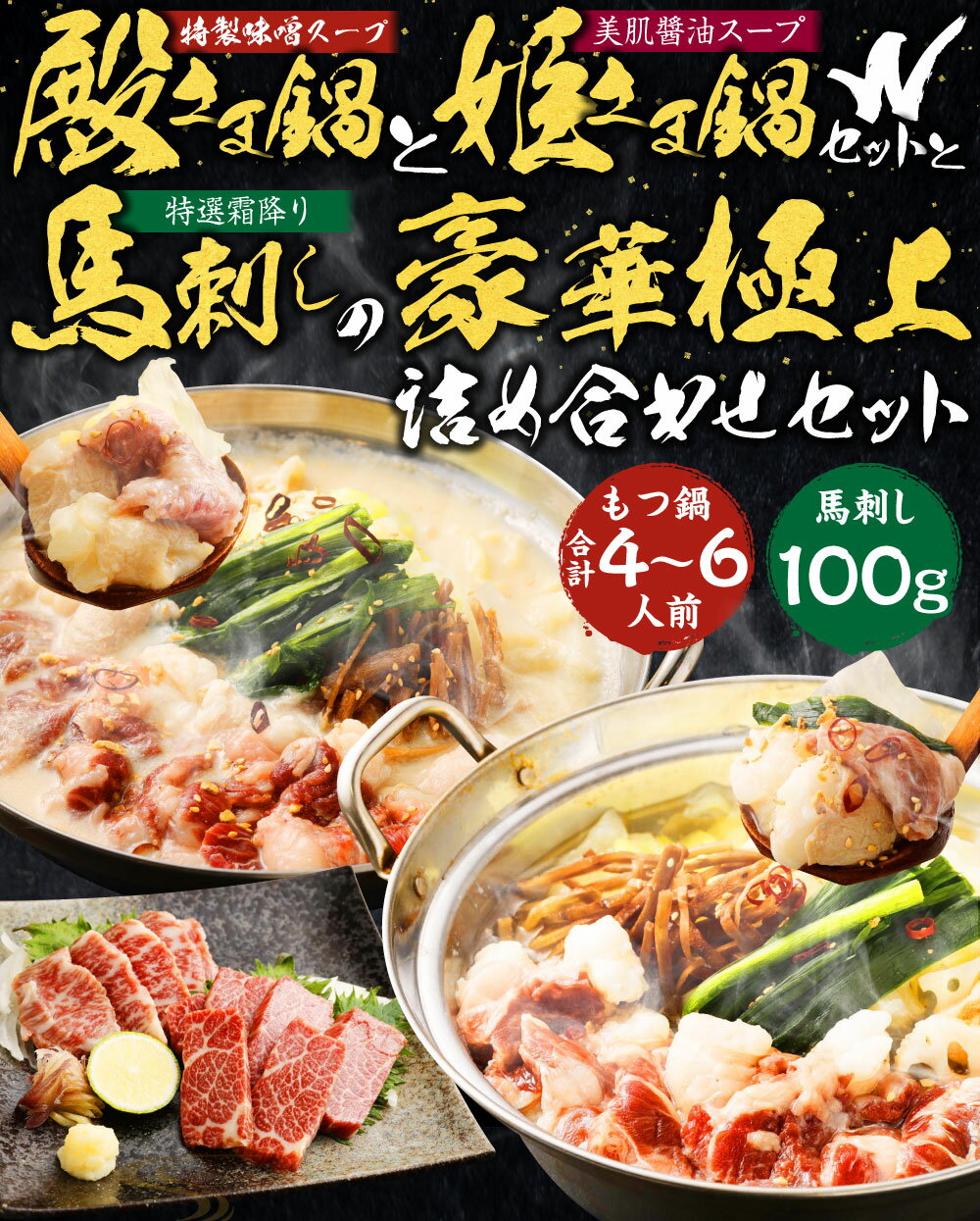 【ふるさと納税】特製味噌スープ「殿さま鍋」と美肌醬油スープ「姫さま鍋」のWセットと特選霜降り馬刺しの豪華極上詰め合わせセット 馬刺し 馬刺 特撰霜降り 味噌 醤油 コラーゲン 美肌 もつ鍋 馬肉 牛もつ 天草大王 熊本県産 冷凍 送料無料