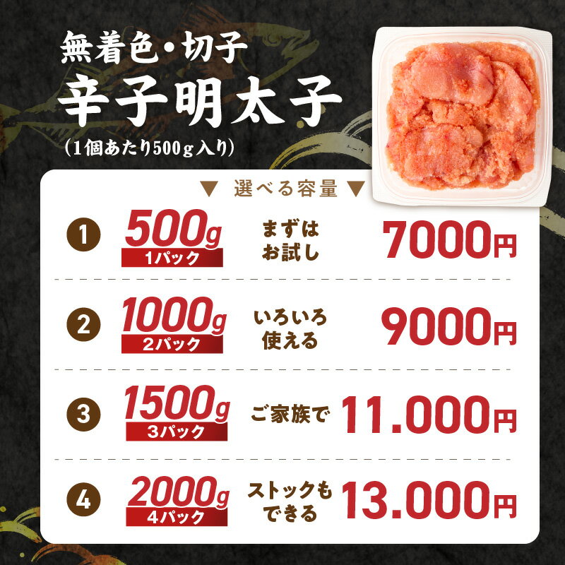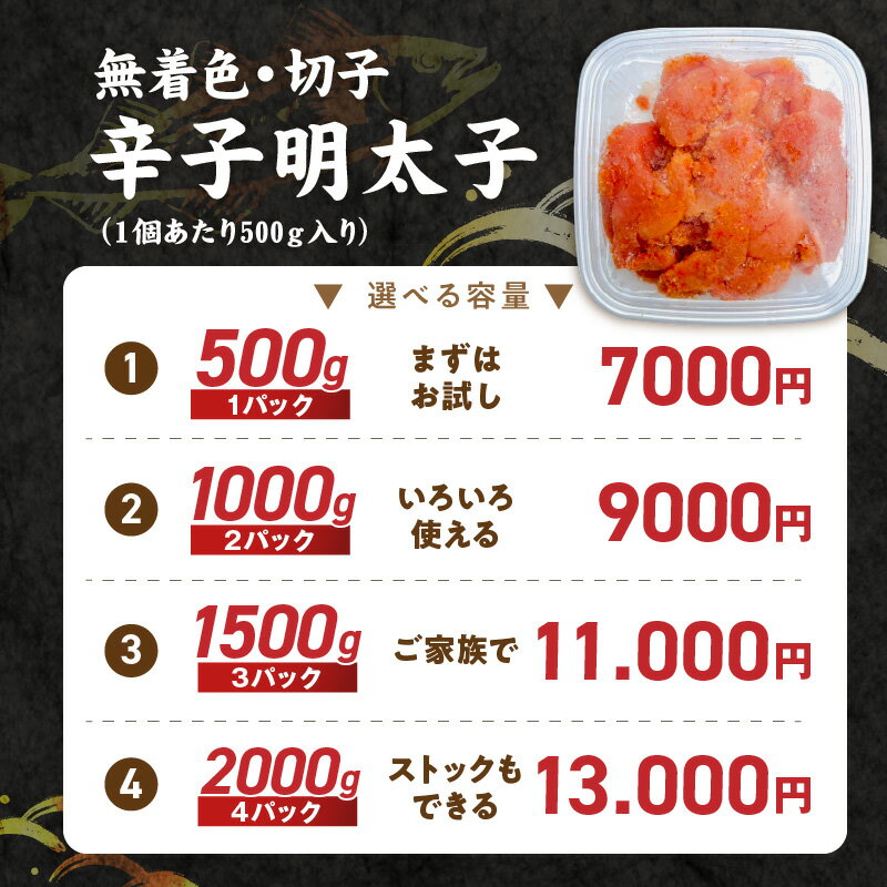 - 【ふるさと納税】 訳あり 無着色 切子 辛子明太子 小分け 選べる 内容量 500g ~ 2kg 配送月指定可能 明太子 切れ子 アツアツご飯 相性抜群 プチプチ はじける 老舗 明太子メーカー 秘伝 調味液 酒の肴 ご飯のお供 パスタ おにぎり トースト 福岡県 久留米市 送料無料