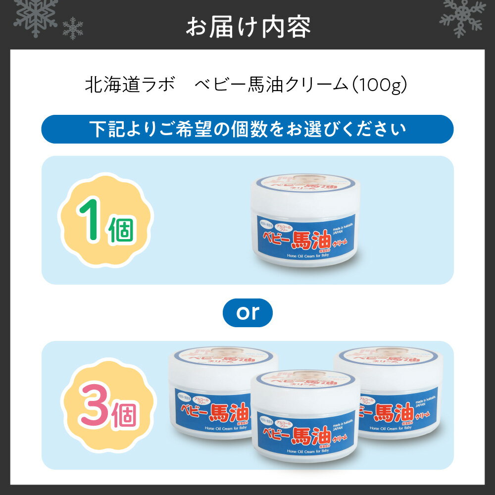- 【ふるさと納税】 ベビー 馬油クリーム 100g 【 選べる 個数 】 1個 3個 北海道ラボ 高保湿 乳液状 スキンクリーム 赤ちゃんにも使える 肌に優しい ヒアルロン酸 コラーゲン 植物エキス 高品質 高濃度 保湿 潤い スキンケア 美容 ギフト プレゼント 北海道 札幌市