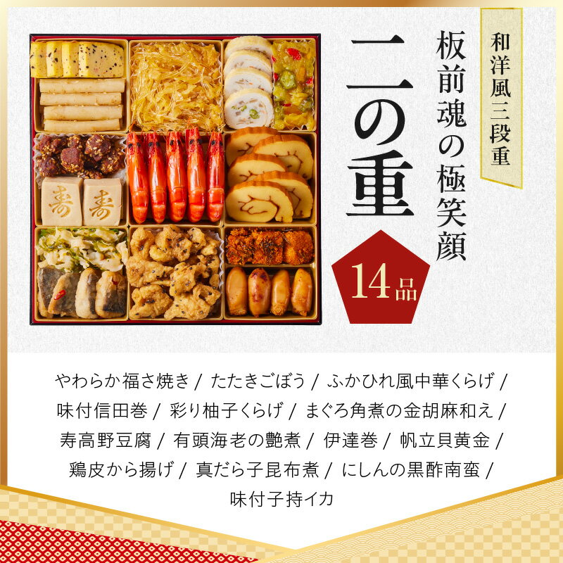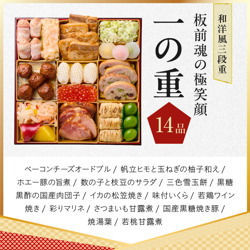 【ふるさと納税】おせち 板前魂の極笑顔 2026年 和洋風 三段重 46品 5人前 8.5寸 雑煮出汁 付き 期間限定 おせち料理 板前魂 三段 国産 和風 洋風 いくら 味付数の子 盛り付け済み 冷凍 迎春 新春 初春 お取り寄せ 大阪府 泉佐野市 先行予約 年内発送 特大