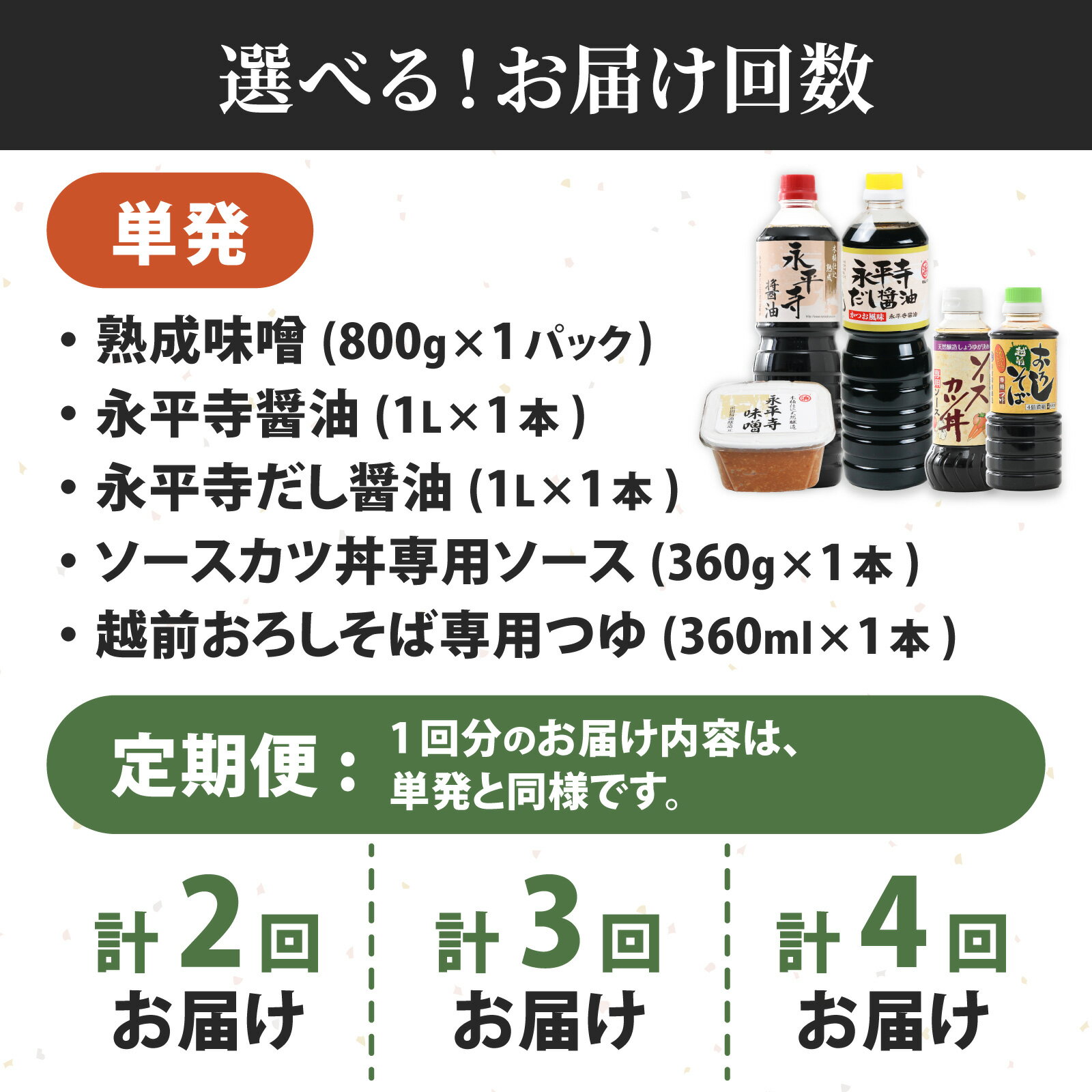 【ふるさと納税】【選べる定期便1~4回】越前・永平寺調味料セット【1回単発便】【2~4回定期便】【お届け対象月 10月,1月,4月,7月】 / 調味料 国産 お味噌 醤油 だし醤油 ソース そばつゆ 味噌汁 しょうゆ 味噌 みそ 天然熟成 米みそ ソースかつ 大豆 永平寺町