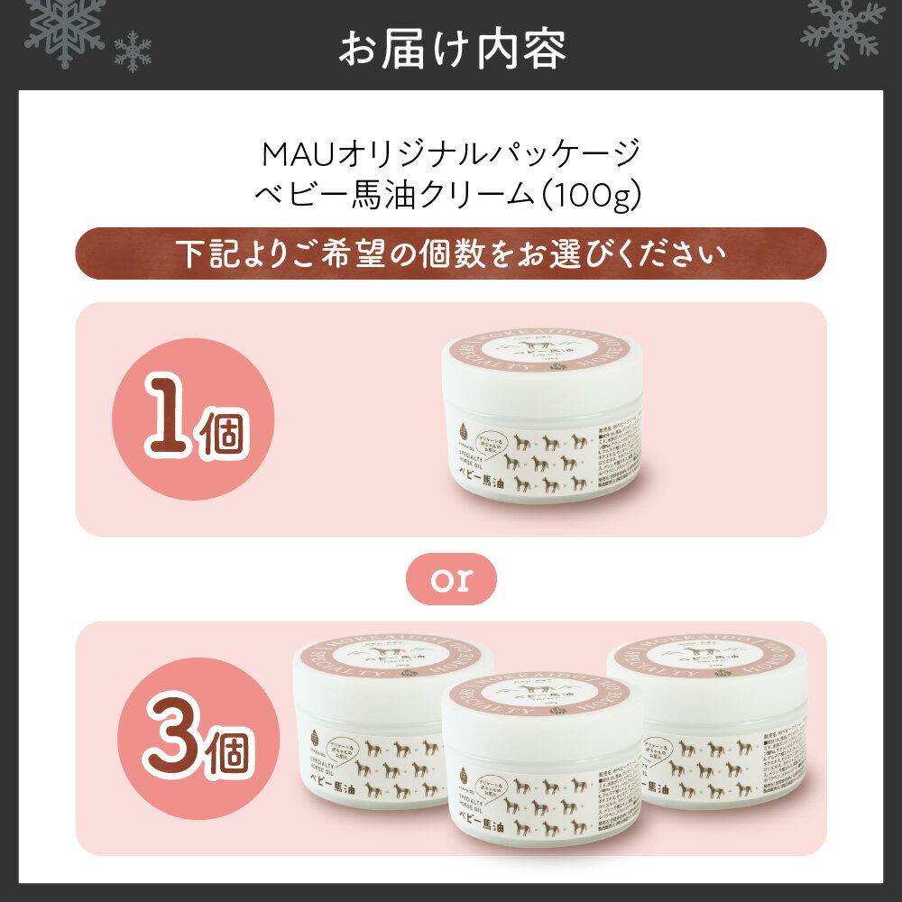 - 【ふるさと納税】 ベビー 馬油クリーム MAU オリジナルパッケージ 100g 【 選べる 個数 】 1個 3個 乳液状 スキンクリーム 赤ちゃんにも使える 肌に優しい ヒアルロン酸 コラーゲン 植物エキス 高品質 高濃度 保湿 潤い スキンケア 美容 ギフト プレゼント 北海道 札幌市