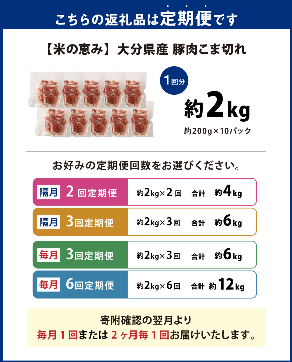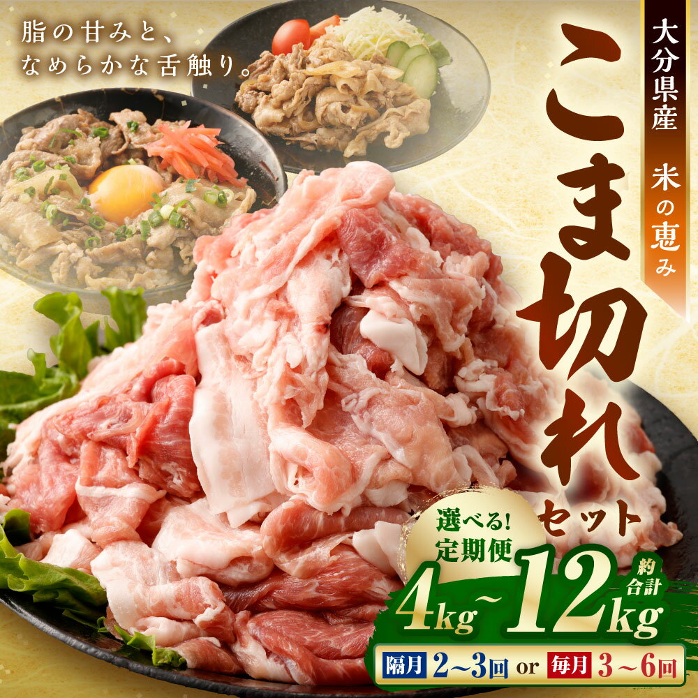 - 【ふるさと納税】【選べる定期便】大容量 こま切れ 1回あたり 約2kgセット 計4kg 計6kg 計12kg 大分県産 豚肉【米の恵み】【毎月】または【隔月】2ヶ月/3ヶ月定期便/6ヶ月定期便 しょうが焼き 豚汁 小分け 個包装 冷凍 九重町 送料無料