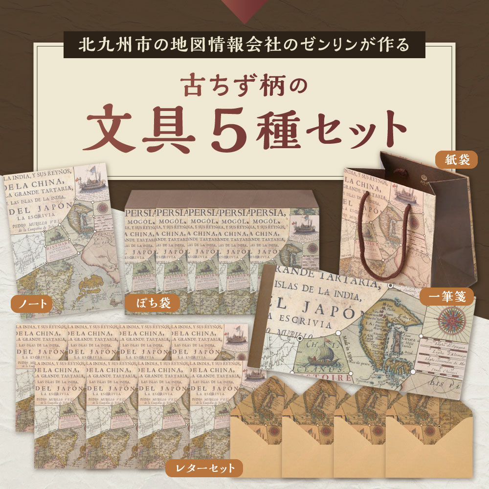 - 【ふるさと納税】古ちず柄 文具 5種セット ぽち袋 一筆箋 レターセット ノート 紙袋 セット 文房具 お手紙 洋風 洋テイスト レトロ アンティーク おしゃれ 古地図 海図 西洋風 船 コンパス 大航海 地図 福岡県北九州市 【ZENRIN】