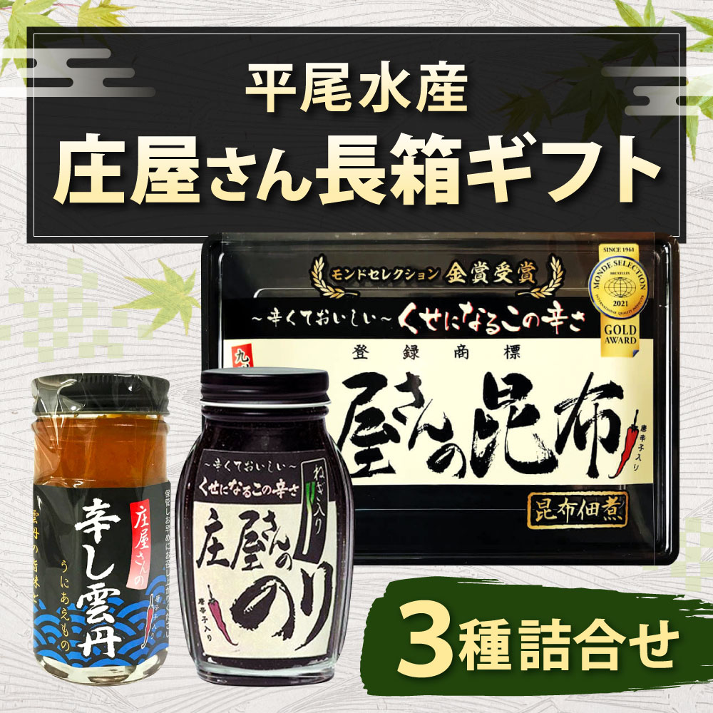 - 【ふるさと納税】平尾水産 庄屋さん 長箱ギフト (庄屋さんの昆布・辛し雲丹・のり瓶) 3種類 食べ比べ 佃煮 つくだに こんぶ うに 海苔 ご飯のおとも おつまみ 酒の肴 晩酌 福岡県 北九州市