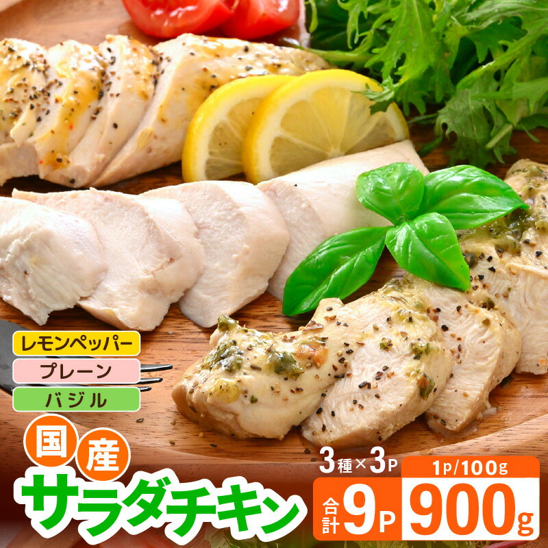 【ふるさと納税】国産若鶏 むね肉 ヘルシーサラダチキン 3種セット 100g × 各3パック(合計900g) プレーン味 / バジル味 / レモンペッパー味 【国産 若鳥 鶏肉 鶏 鳥肉 ムネ肉 サラダ チキン 小分け パック おかず 低カロリー ヘルシー ダイエット 加工品 冷凍】