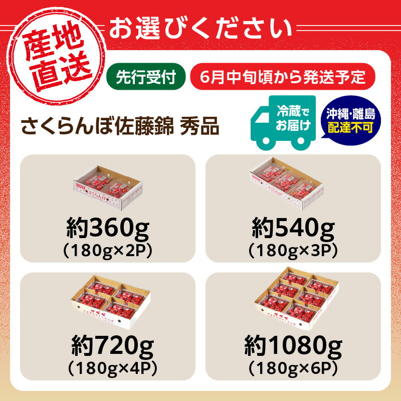 - 【ふるさと納税】【2026年度先行受付】★さくらんぼ佐藤錦★秀品 選べる内容量(360g~1080g) 【6月より順次発送予定】 ふるさと納税 山形県 大江町 さくらんぼ 佐藤錦 秀品 果物 フルーツ デザート 人気