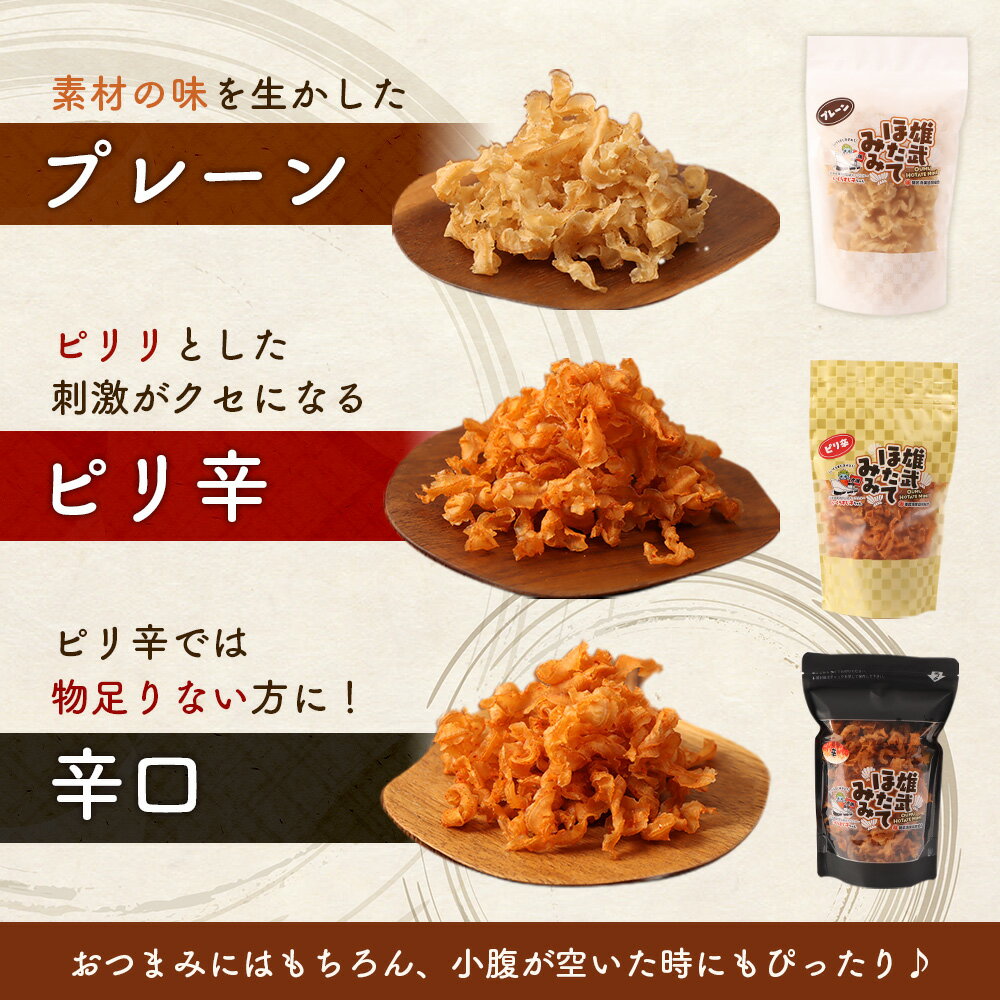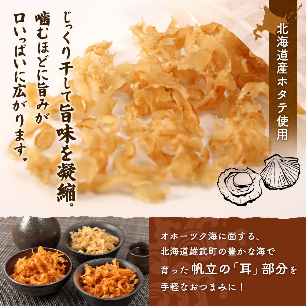 【ふるさと納税】北海道産ホタテ貝ひも 雄武ほたてみみ80g×3種セット(プレーン・ピリ辛・辛い!) | ホタテ 帆立 干し耳 おつまみ 海鮮 貝類 乾物 珍味 北海道産 酒の肴 つまみ スナック 噛み応え 旨み うまみ 味付け ほたて 80g お取り寄せ 北海道 雄武町 雄武【07178】