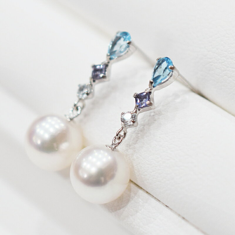 【ふるさと納税】ピアス あこや真珠 7.5mm - 8mm 半貴石 アイオライト ブルートパーズ 3連 K14WG ホワイトピンク 真珠 パール アクセサリー ジュエリー 品質保証書 ジュエリーケース 真珠てりクロス お取り寄せ 熊本県 天草市 送料無料