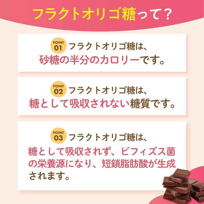 「フラクトオリゴ糖」入りのチョコレートの返礼品です。フラクトオリゴ糖は難消化性で、糖として吸収されず、ビフィズス菌や乳酸菌などの栄養となります。これらの菌を増やして、腸内フローラを整えることを助けるとされています。オリゴスマートは、使う砂糖の半量をフラクトオリゴ糖に置き換えた、ミルクたっぷりのチョコレートです