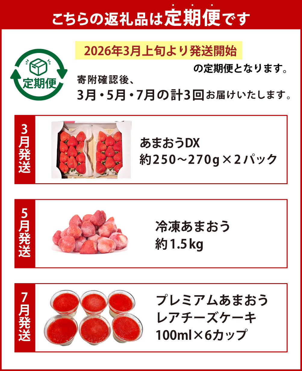 - 【ふるさと納税】【予約受付・3回定期便】 あまおう贅沢セット No2 合計3種 あまおうDX 約250~270g×2パック 冷凍あまおう 約1.5kg プレミアムあまおうレアチーズケーキ 100ml×6カップ いちご 冷凍 送料無料 【2026年3月上旬~7月下旬発送予定】