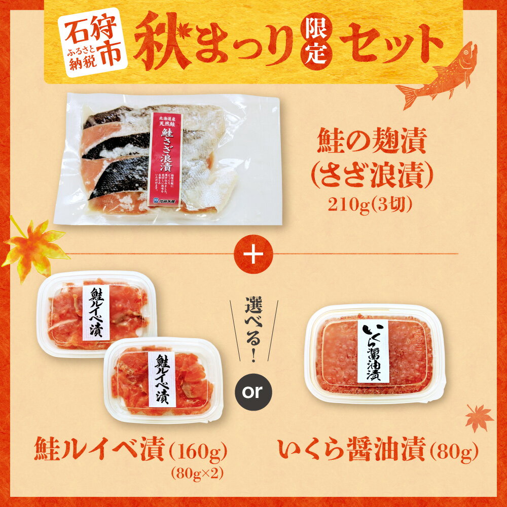 - 【ふるさと納税】【秋まつり限定】佐藤水産 北海道産 秋鮭 さざ浪漬 210g 3切【選べる内容】 鮭ルイベ漬 160g いくら醤油漬 80g お試しセット いくら ルイベ 切身 米糀 鮭醤油 冷凍 海鮮珍味 ご飯のお供 おつまみ 北海道 石狩市