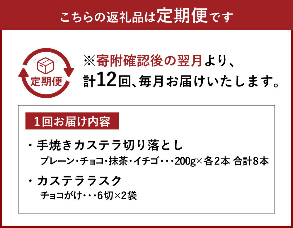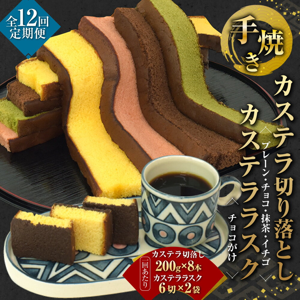 - 【ふるさと納税】【全12回定期便】手焼きカステラ切り落とし 200g×各2本×4種 計8本 カステララスク 6切×2袋 1セット×12回 計12セット カステラ チョコ 抹茶 いちご ラスク スイーツ 長崎 国産 九州 常温 長崎県 長崎市 送料無料