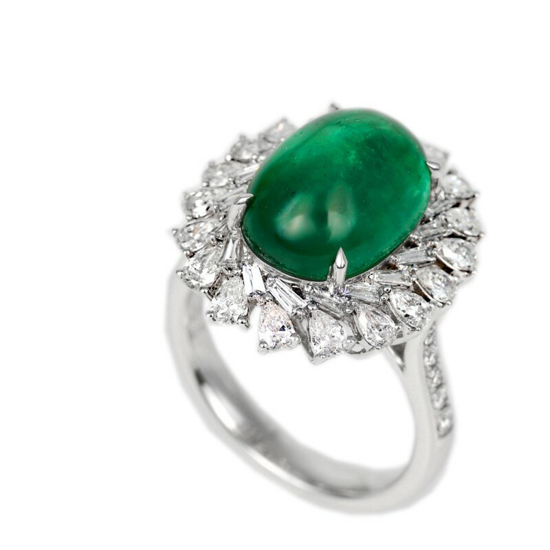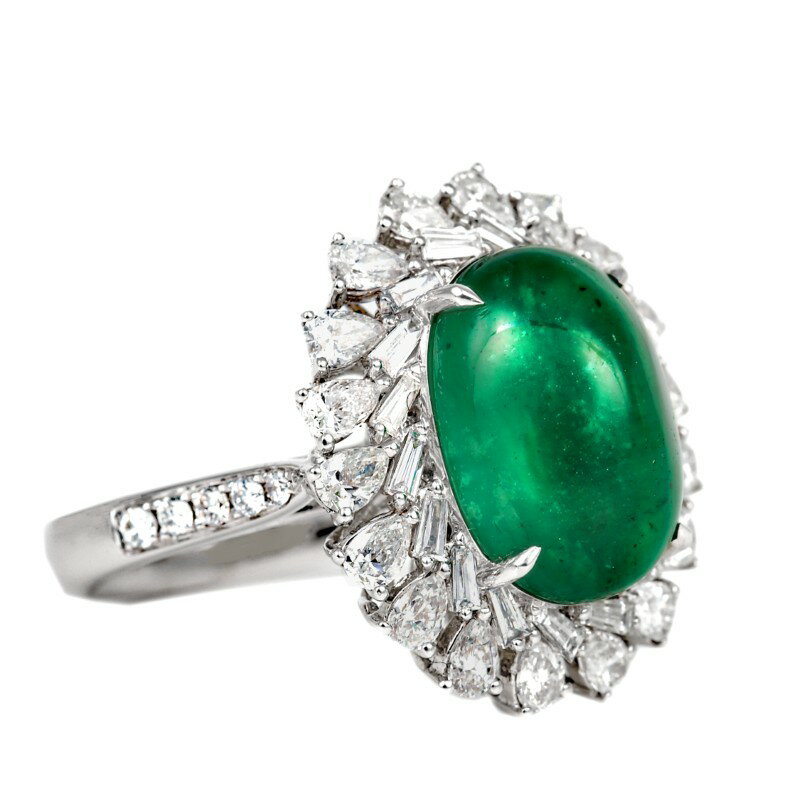 【ふるさと納税】< 甲府ジュエリー > リング 指輪 ジュエリー レディース アクセサリー エメラルド 7.03CT 大粒 K18 WG カボションルース ダイヤモンド 1.54CT ギフト プレゼント ラッピング 誕生日 ジュエリーケース付 鑑別書付 保証書付 k098-352
