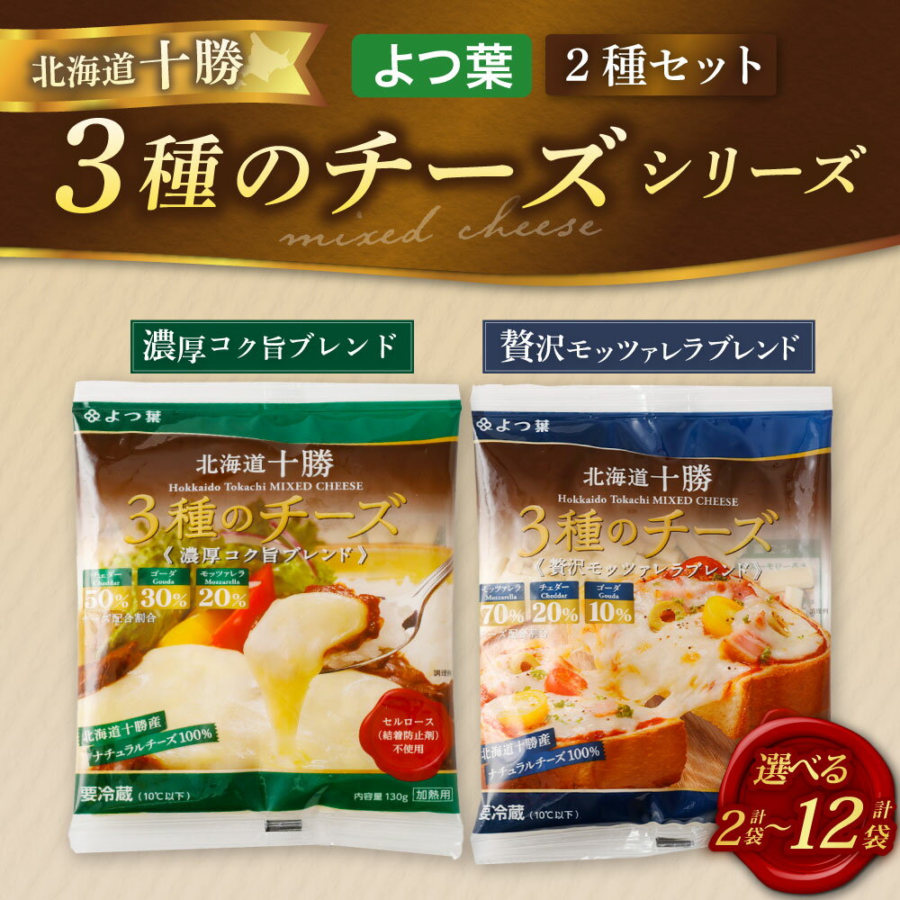 - 【ふるさと納税】<選べる内容量>「よつ葉」 北海道十勝 3種のチーズシリーズ 2種セット 濃厚コク旨ブレンド・贅沢モッツァレラブレンド 2~12袋 各1~6袋 チェダー ゴーダ モッツァレラ ナチュラルチーズ ミックスチーズ 生乳 乳製品 料理 冷蔵