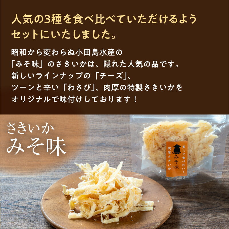 - 【ふるさと納税】特製 さきいか 3種 味くらべ セット みそ味 チーズ わさび 各 50g 肉厚 オリジナル フレーバー 函館の味 ビール おつまみ おやつ お酒のお供 お酒 晩酌 乾物 珍味 食品 魚介 加工品 大正3年 創業 函館小田島水産 お取り寄せ グルメ 北海道 函館市 送料無料