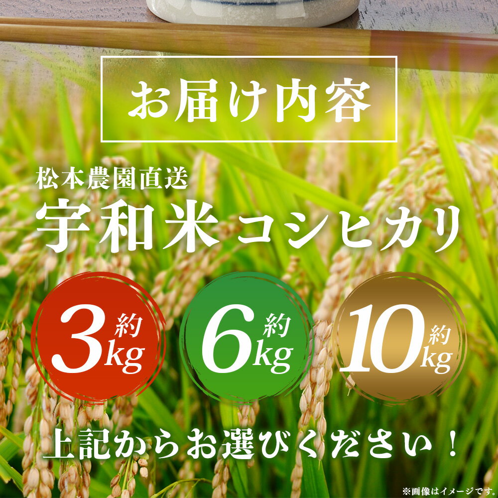 - 【ふるさと納税】新米<令和7年産 松本農園直送 宇和米(コシヒカリ)約3kg/6kg/10kg> こしひかり 米 コメ こめ 白米 精米 うわまい ご飯 新鮮 3キロ 6キロ 10キロ 選べる お弁当 朝 昼 夜 国産 特産品 愛媛県 西予市【常温】『2025年9月下旬~12月下旬迄に順次出荷予定』
