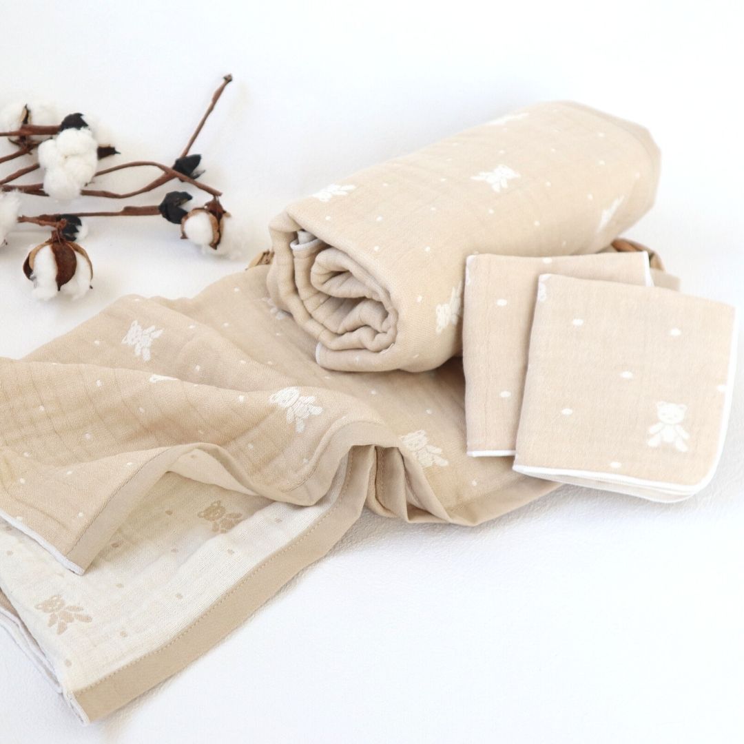 - 【babybear】多重ガーゼ タオルセット ベージュ ミニバスタオル ハンカチタオル 薄手 カーゼ 柔らかい 泉州南部織 MBT755匁 HC51匁 吸水力 速乾 日常使い 日用品 大阪府 泉佐野市 送料無料