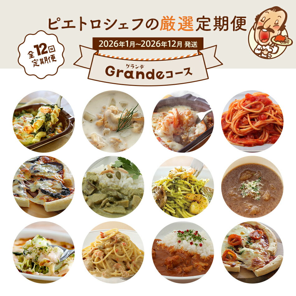 【ふるさと納税】ピエトロシェフの厳選定期便Grandeコース【年12回発送】 (パスタ ソース スープ ピザ ドリア グラタン パスタ カレー) 定期発送 保存食 備蓄 レトルト 冷凍 常温 送料無料 【2026年1月〜12月まで計12回お届け】