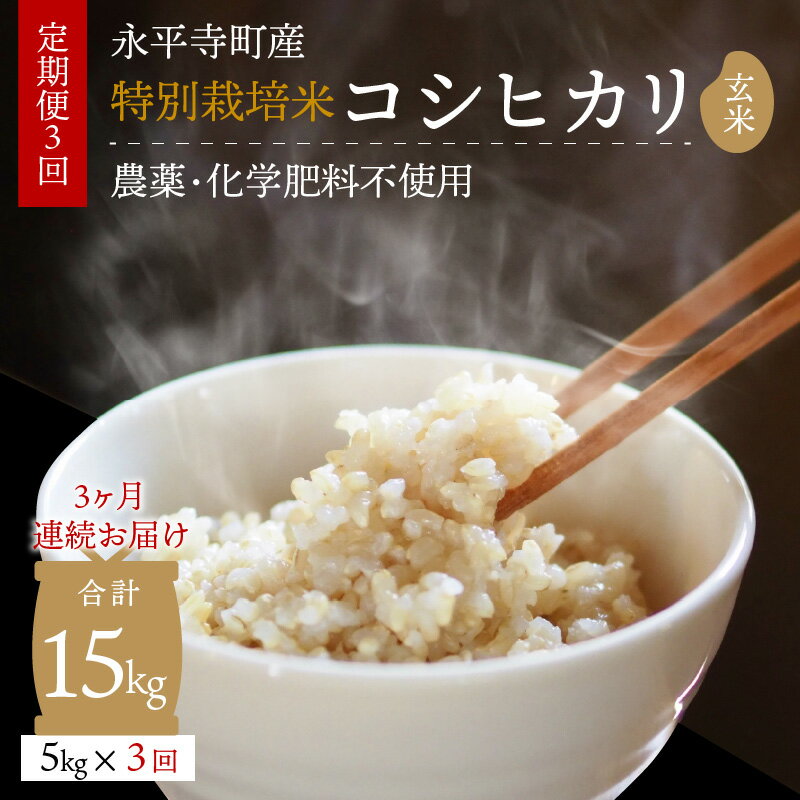 - 【ふるさと納税】【先行予約】【3ヶ月定期】【玄米】 令和7年度産 永平寺町産 農薬不使用・化学肥料不使用 特別栽培米 コシヒカリ 5kg×3ヶ月(計15kg)【10月より順次発送 頒布会 無農薬 ご飯 ごはん こめ 定期便 5キロ 5kg 米 米 お米 コメ 送料無料 こしひかり 福井