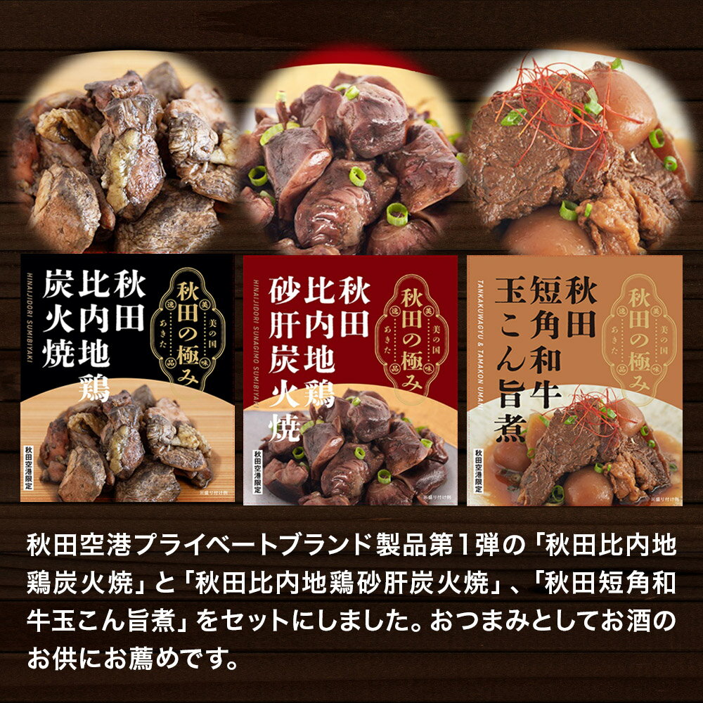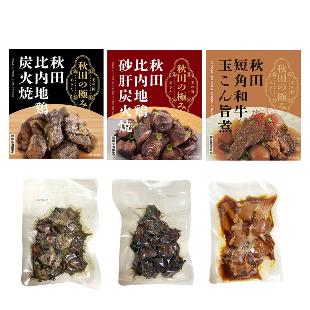 - 【ふるさと納税】秋田の極み 第1弾セット(鶏炭火焼100g×1個、鶏砂肝炭火焼100g×1個、短角和牛玉こん旨煮180g×1個)