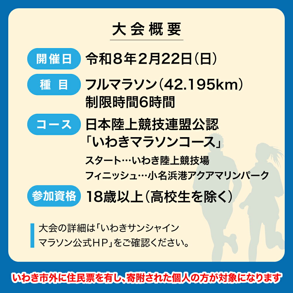 - 【ふるさと納税】【先着50名限定】第17回いわきサンシャインマラソン フルマラソンのふるさと納税ランナー枠の出走権(駐車場代込み)【1名様分】 | 先着限定 フルマラソン いわきサンシャインマラソン 駐車場付 地元応援 地域貢献 限定受付 スポーツファン | IS001-2026