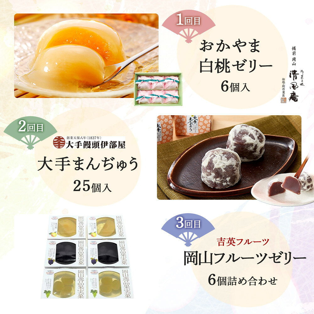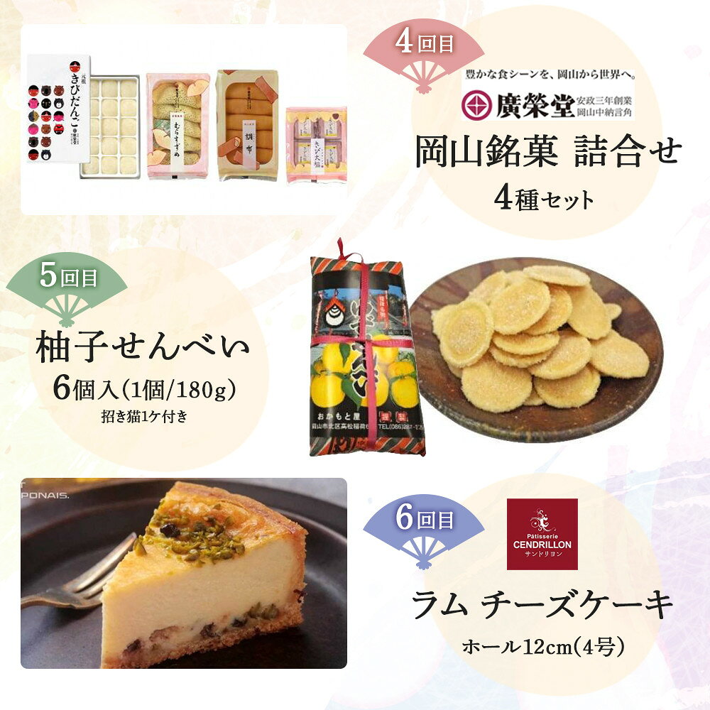 - 【ふるさと納税】【定期便 6回】岡山和洋スイーツ(大手まんぢゅう・フルーツゼリー・岡山銘菓 詰合せ ・白桃ゼリー・柚子せんべい・ラムチーズケーキ) | 菓子 おかし 食品 人気 銘菓 おすすめ 送料無料 岡山市
