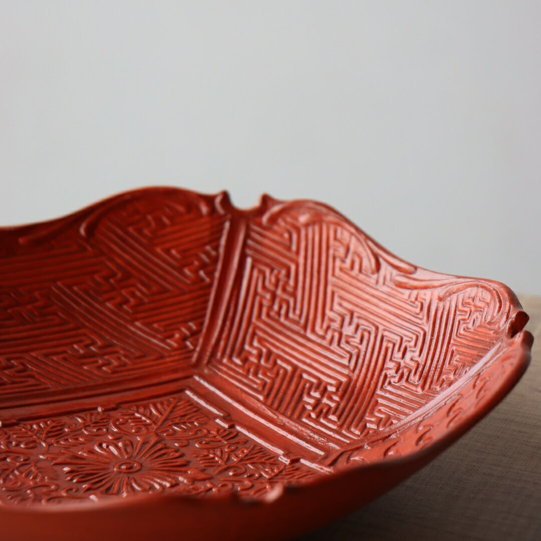 - 【ふるさと納税】有田焼 レリーフ地紋彫 プレート 朱巻 1枚【山忠】食器 器 うつわ 和食器 皿 深皿 盛皿 鉢 ハレの日 お正月 上品 お祝い 朱色 朱 赤 レッド 電子レンジ対応 A70-177