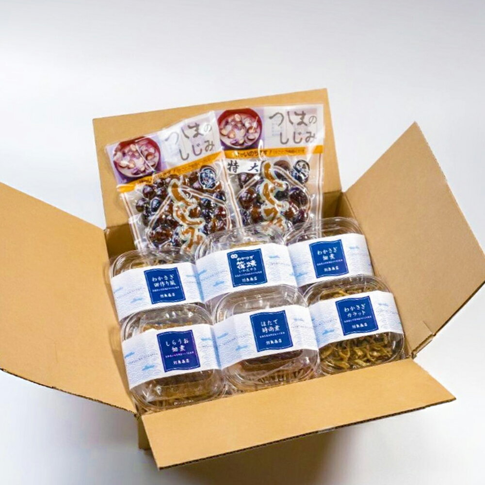 - 【ふるさと納税】対島商店おすすめセット(わかさぎ筏焼き3串・わかさぎ佃煮40g・わかさぎ田作り風30g・わかさぎカラット30g・ほたて時雨煮40g・しらうお佃煮40g・しじみ(調理済)150g・しじみ(調理済)150g(大)) 【02408-0163】 青森県 東北町 小川原湖 対島商店
