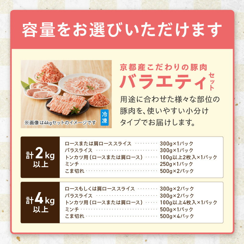 - 【ふるさと納税】京都産こだわりの豚肉 バラエティセット 2kg以上 4kg以上 選べる 内容量 配送時期 豚肉 ロース ろーす 肩ロース バラ ばら ミンチ みんち こま切れ 小間切れ とんかつ 豚カツ セット 京都 ふるさと納税 豚肉セット 詰め合わせ 2kg 4kg しゃぶしゃぶ