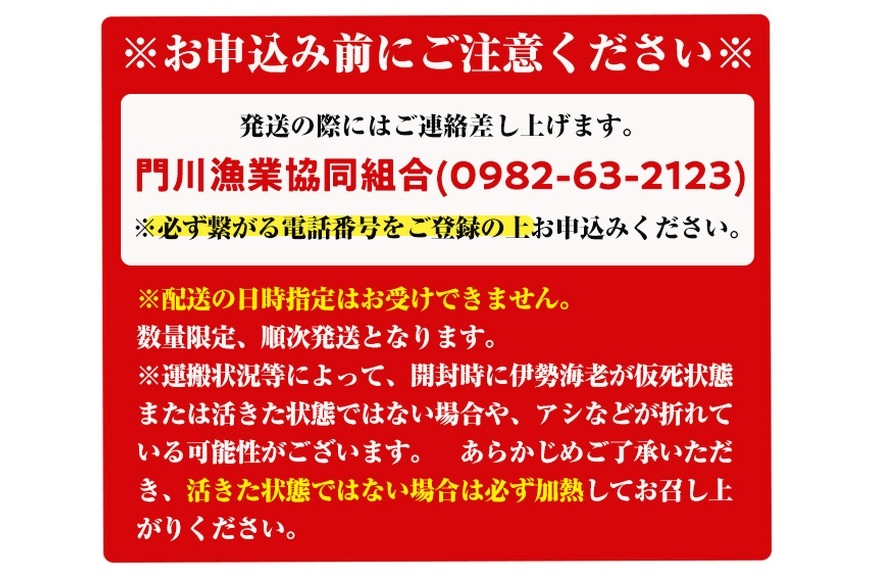<数量限定・期間限定>天然!門川町産活き伊勢海老(計1.5kg・約2~6尾)エビ えび 刺身 魚介 海鮮 朝獲れ 国産【O-6】【門川漁業協同組合】