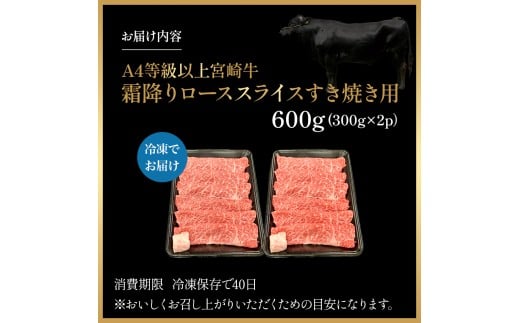 - 宮崎県西ノ原牧場・A4等級以上宮崎牛霜降りすき焼きロース 600g(国産 牛肉 肉 宮崎牛 黒毛和牛 お肉 すき焼き なかにし和牛 焼肉 人気 ロース 霜降り)