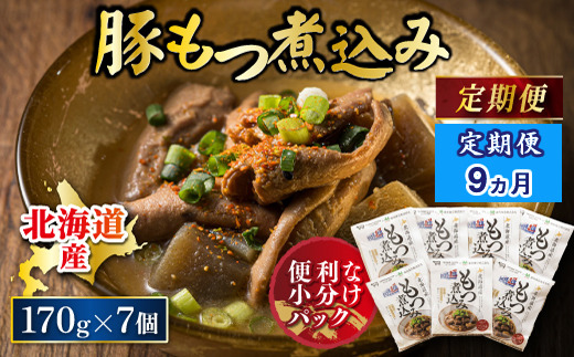 - 【定期便 9ケ月連続】 北海道産 もつ煮込み 170g×7パック 豚肉 豚もつ 豚ホルモン 煮込み 惣菜 晩酌 おつまみ ご飯のお供 簡単調理 温めるだけ レトルト レトルト食品 常温保存 お取り寄せ 森谷食品 トリプリしおた コラボ 一人暮らし おかず ご当地グルメ 北海道 釧路町 釧路超 特産品 br03 121-1224-143-004