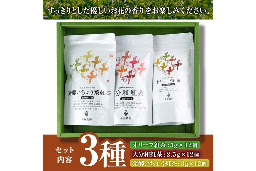 - 紅茶 ティーバッグ 3種セット (オリーブ紅茶、和紅茶、いちょう葉紅茶・各12個) お茶 紅茶 茶 茶葉 セット 詰め合わせ 大分県 佐伯市【ES04】【小野農園】