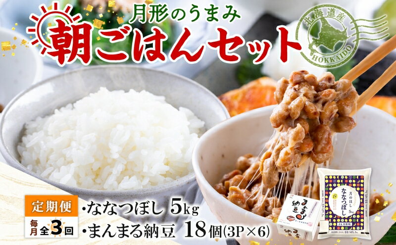 - 【ふるさと納税】【3ヶ月定期便】北海道 月形 のうまみ 朝ごはんセット まんまる 納豆 18個 ななつぼし 5kg お米 保存料不使用 安心 安全 手作業 美味しい 大粒 タレ付 からし付 お取り寄せ 送料無料 エーコープつきがた 月形町