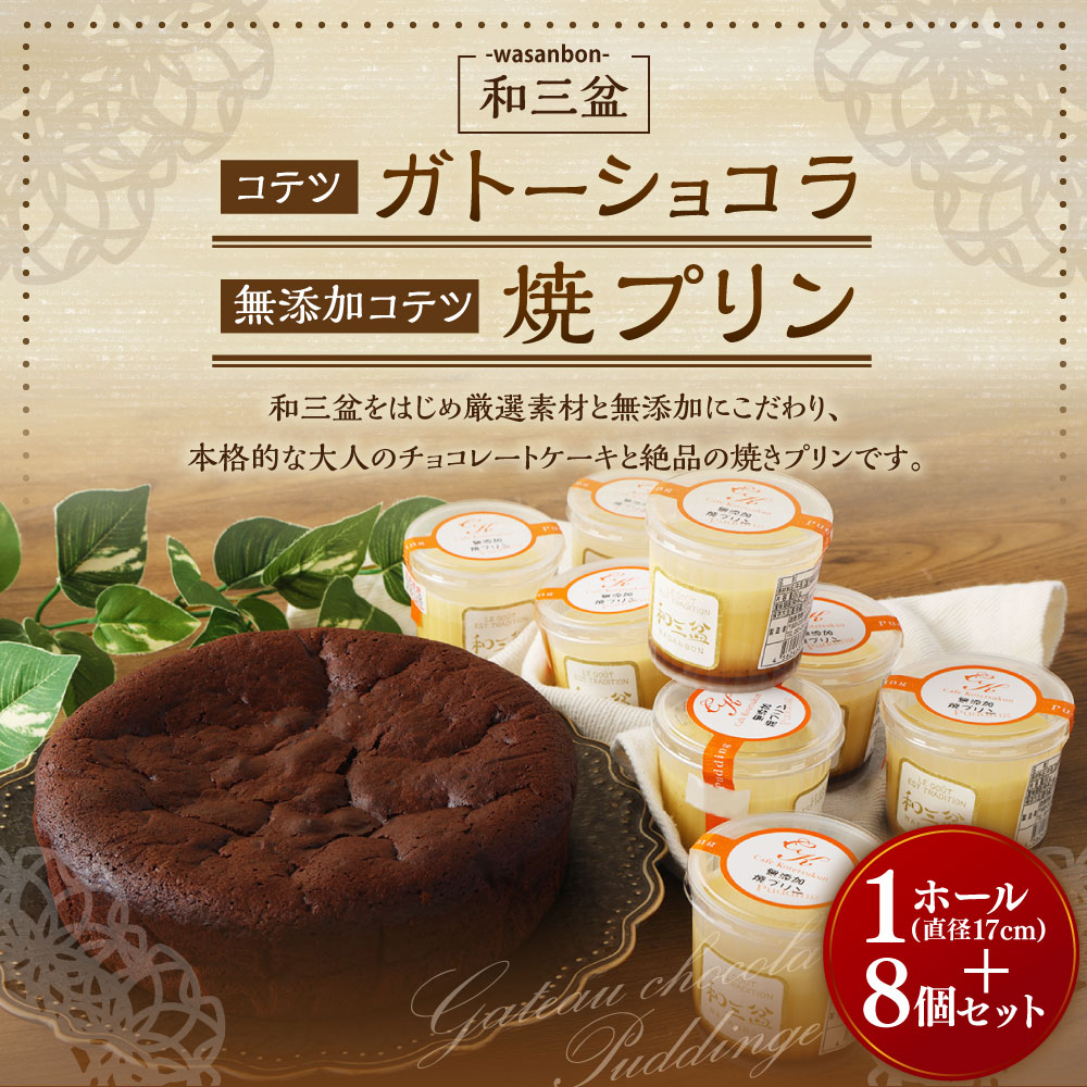 - 【ふるさと納税】和三盆 コテツガトーショコラ 和三盆 無添加 コテツ焼プリン8個 2種 セット 1ホール 5.5号 直径17cm ケーキ わさんぼん ガトーショコラ プリン デザート 食べ比べ 詰め合わせ 洋菓子 スイーツ 福岡県 苅田町 送料無料