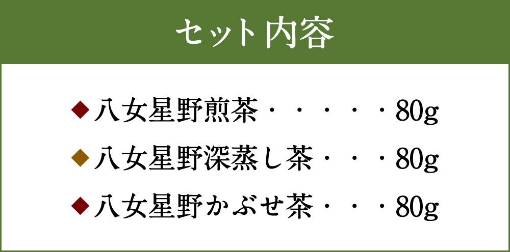 - 【ふるさと納税】八女 星野茶 詰合せ 星乃絆 計240g (煎茶 80g・深蒸し茶 80g・かぶせ茶 80g) 福岡県 八女市 星野村産 お茶 緑茶 茶葉 日本茶 深蒸茶 深むし茶 せんちゃ 飲み比べ 詰め合わせ セット ギフト 贈り物 送料無料