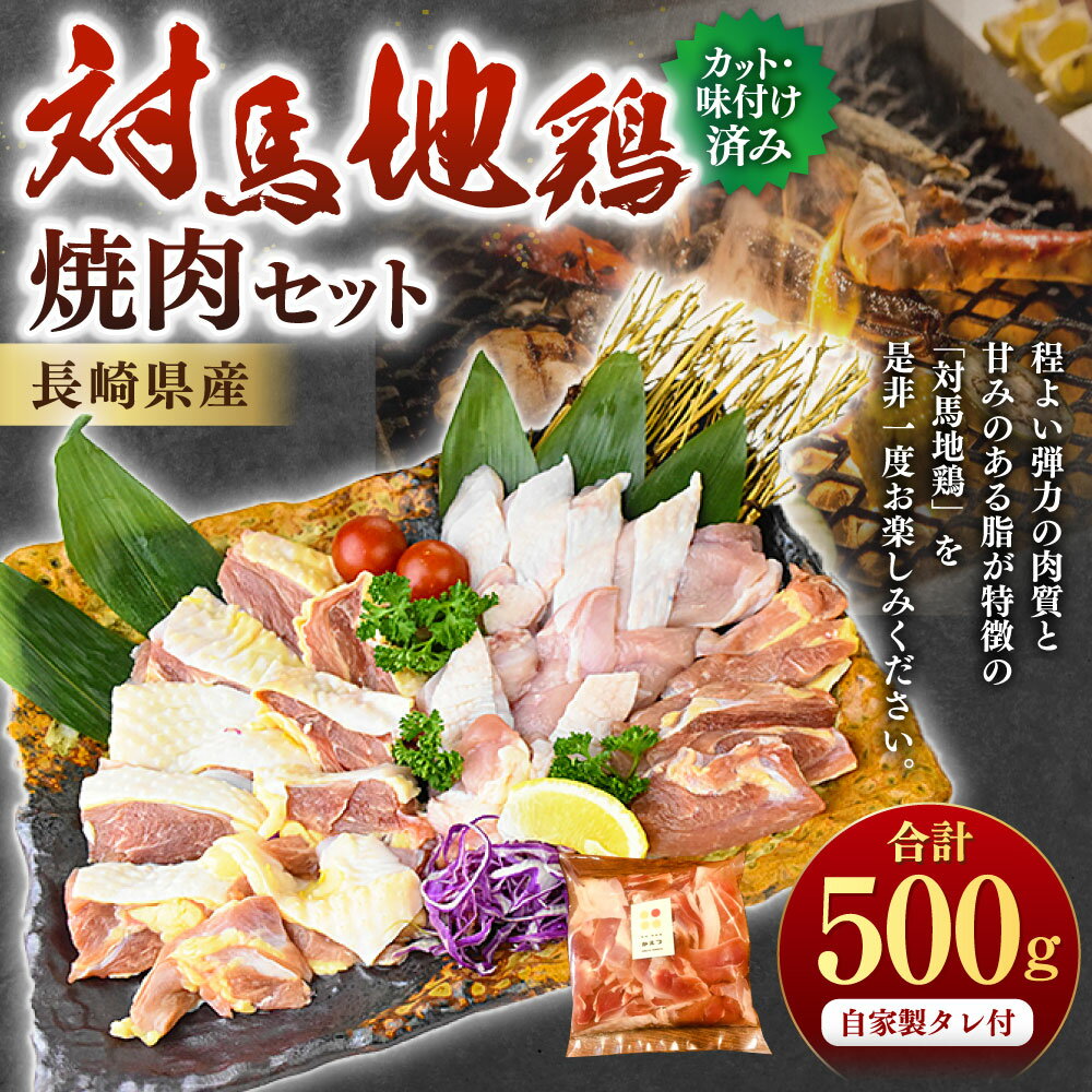 【ふるさと納税】【7営業日以内発送】長崎県産 対馬地鶏 焼肉セット 計約500g 自家製タレ付 鶏もも肉 鶏むね肉 モモ ムネ 焼肉用 焼肉 肉 ユッケ 鶏 地鶏 味付き カット タレ セット 対馬 冷凍 国産 九州 長崎県 長崎市 送料無料