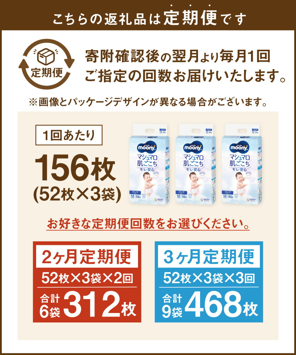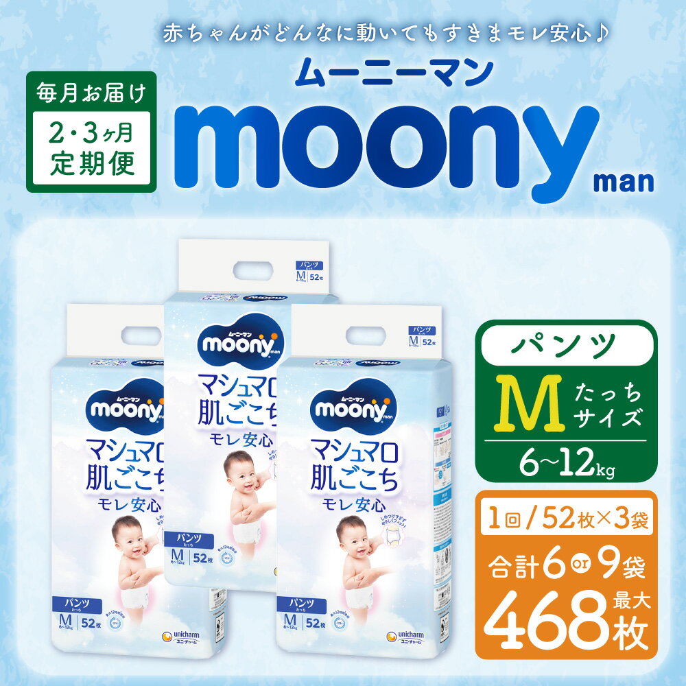 - 【ふるさと納税】【選べる定期便】 ムーニーマン Mサイズたっち 52枚×3袋 ( 2回 / 3回 ) 計312枚 計468枚 Mサイズ 子供用 男女共用 ユニ・チャーム 紙オムツ パンツタイプ ベビー用品 福岡県 苅田町 送料無料