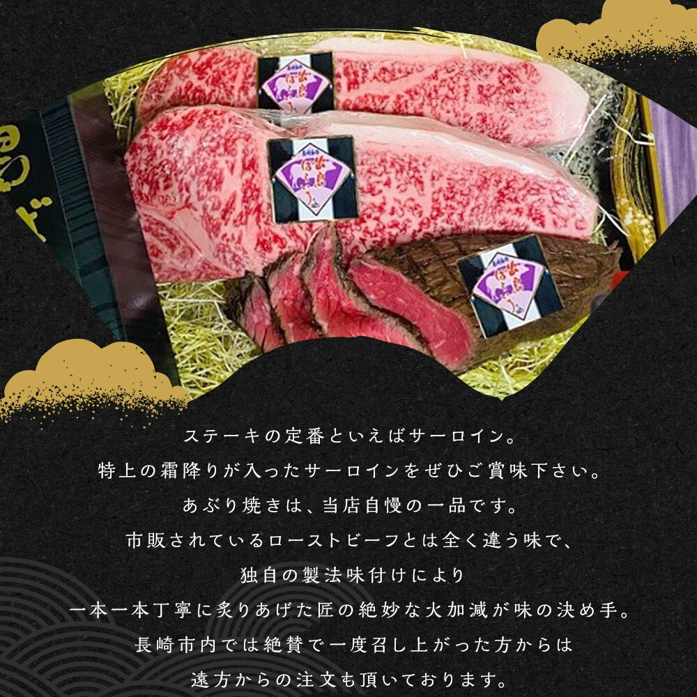 【ふるさと納税】出島ばらいろサーロインステーキ(約200~300g×2枚)&あぶり焼き(約200g)のセット 長崎和牛 牛肉 お肉 霜降り 自家製たれ タレ 化粧箱入り 惣菜 冷凍 長崎県産 国産 九州 長崎県 長崎市 送料無料