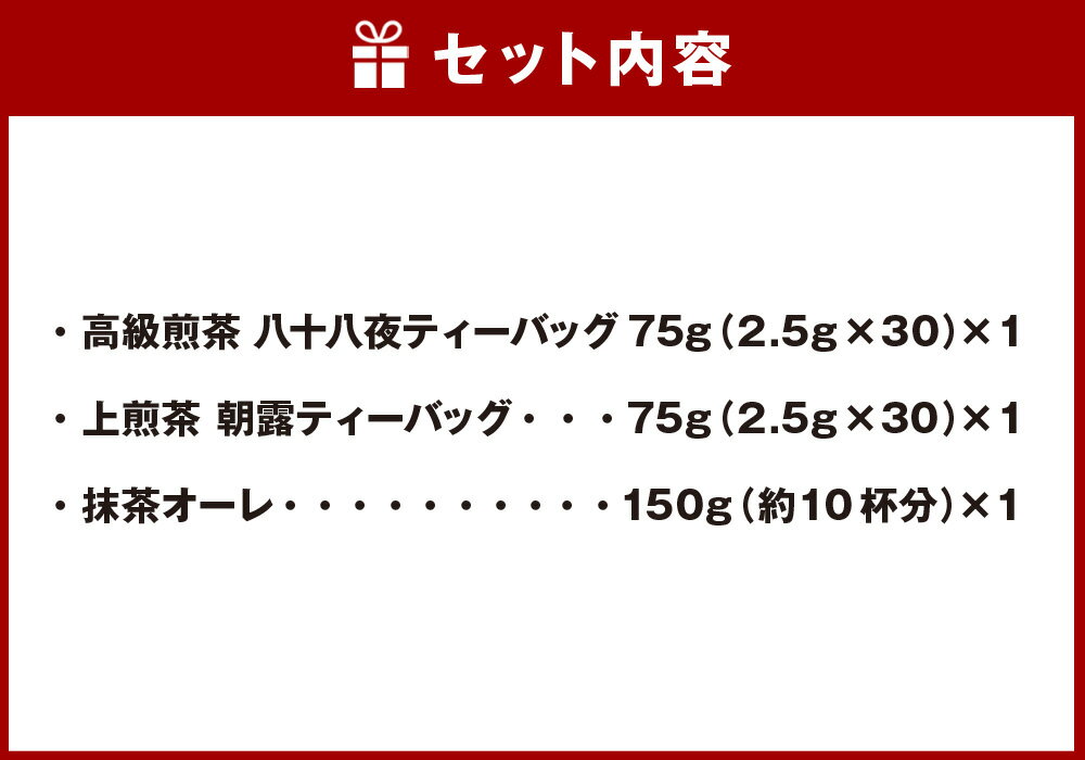 【ふるさと納税】中山吉祥園 八女茶3種セット【八十八夜ティーバッグ 75g(2.5g×30) 朝露ティーバッグ 75g(2.5g×30) 抹茶オーレ150g(約10杯分)】 国産 ティーバッグ セット 八女茶 お茶 茶 緑茶 煎茶 抹茶 朝露 一番茶 福岡県 八女市 送料無料
