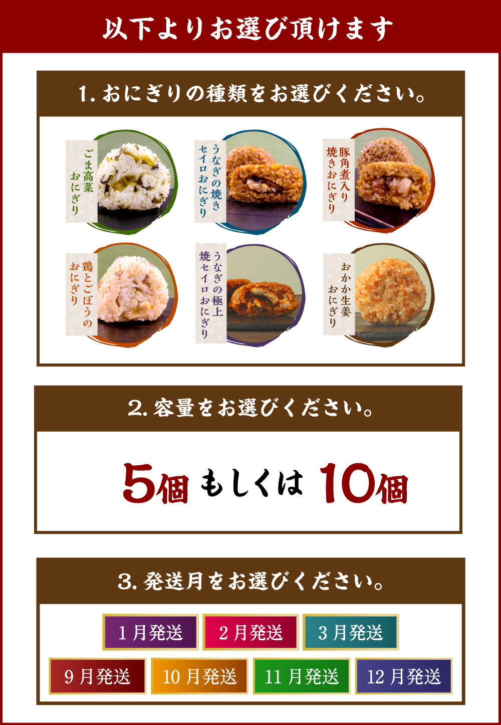 【ふるさと納税】【 マツコの知らない世界 で紹介されました!】<選べる種類・発送月> 手作りおにぎり 110g×10個/110g×5個 ごま高菜 うなぎの焼セイロおにぎり 豚角煮入り焼きおにぎり 豚角煮 おかか生姜 うなぎの極上焼セイロ 7500円 ~ 32500円 7千500円 ~ 3万2500円