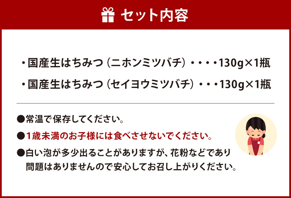 【ふるさと納税】国産 生はちみつ 詰め合わせ 2種類×各130g 合計260g ニホンミツバチ/セイヨウミツバチ 蜂蜜 ハニー ハチミツ 日本 西洋 食べ比べ トッピング 調味料 甘味 高品質 百花蜜 最高級 北九州市産 九州 送料無料