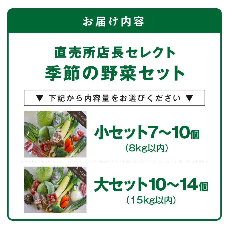 - 【ふるさと納税】直売所 店長セレクト 季節の野菜セット 小 7個 〜 10個 8kg以内 / 大10個 ~ 14個 15kg以内 JA大阪泉州 農産物直売所 こーたり〜な とれたて 新鮮 野菜 詰め合わせ セット 野菜セット 泉佐野市産 泉州産 国産 お取り寄せ 大阪府 泉佐野市 送料無料