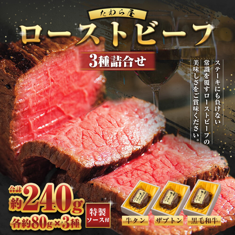 【ふるさと納税】牛タン・ザブトン・黒毛和牛ローストビーフ三種詰合せ 計約240g (各約80g×3種)【たわら屋】 50,000円 牛肉 和牛 肉 お肉 ソース入り ソース付き 食べ比べ お祝い 贈り物 惣菜 おかず おつまみ お取り寄せ 冷凍 静岡県 菊川市 送料無料