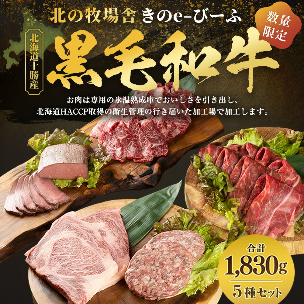 - 【ふるさと納税】【数量限定】「北の牧場舎」きのe-びーふ 黒毛和牛 5種 8点セット 合計1830g 黒毛和牛 ロースステーキ ハンバーグ ローストビーフ 焼肉 すき焼き ステーキ 牛肉 牛 肉 お肉 セット 詰め合わせ 冷凍 国産 楽天スーパーSALE 9月開催