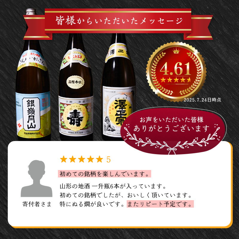 - 【ふるさと納税】山形 の日本酒 飲み比べ セット (1800ml × 6本)【支援品】 / 地酒 お取り寄せ ご当地 一升瓶 1,800ml 家飲み 宅飲み おうち時間 米どころ 酒どころ 詰め合わせ 東北 おもてなし 蔵元 酒蔵 熱燗 ぬる燗 冷 酒