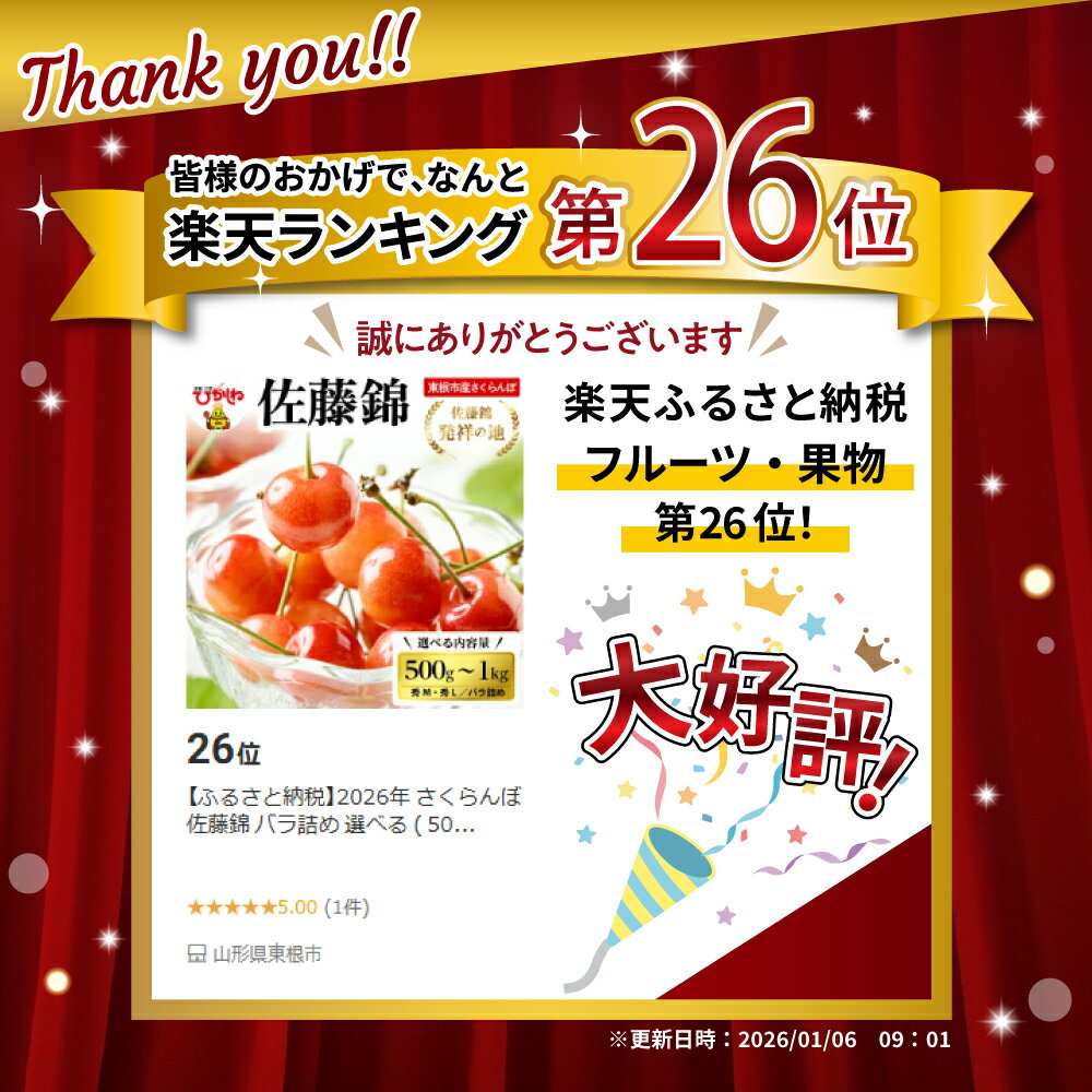 - 【ふるさと納税】2026年 さくらんぼ 佐藤錦 バラ詰め 選べる ( 500g 600g 700g 720g 1kg ) サクランボ フルーツ 果物 くだもの 箱入り 化粧箱 バラ詰め 贈り物 ギフト 贈答 冷蔵 期間限定 冷蔵配送 先行予約 送料無料 東北 山形県 東根市【2026/6/5~6/20順次出荷予定】
